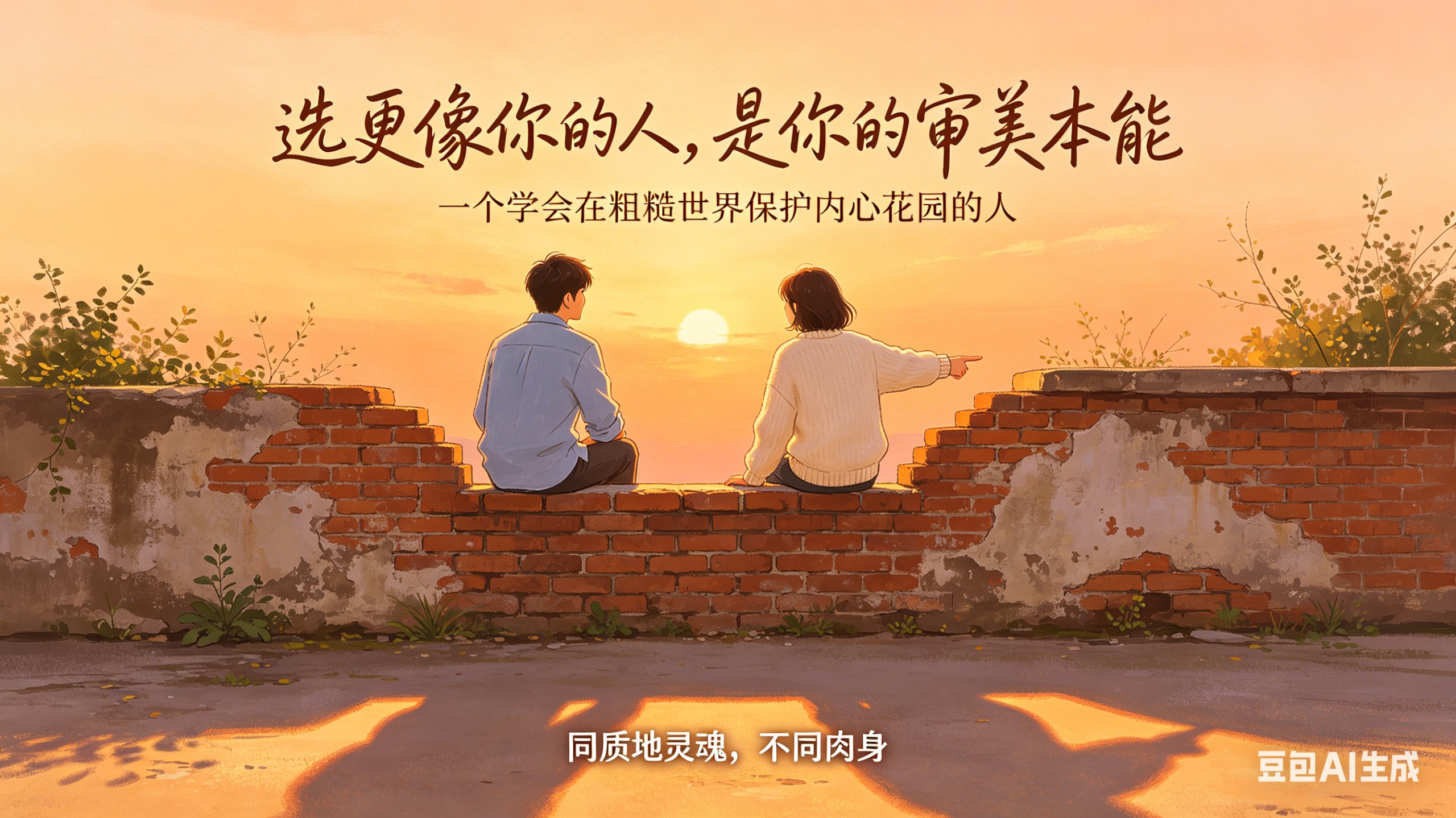 选更像你的人,是你的审美本能,是你灵魂的排异反应在拒绝那些无趣的灵魂。请务必尊重这个本能。 但你要找的那个同类,最好是 “一个已经学会了在这个粗糙的世界上,笨拙地保护自己内心花园的人”。 他/她不是和你一起蹲在墙角哭泣的人,而是和你一起坐在墙头看夕阳,顺便提醒你哪个墙头比较结实不会塌的人。 你们是同一种质地的灵魂,住在两具功能略有差异的肉身里。这才是“像我的人”在现实中最温柔、也最长久的形态