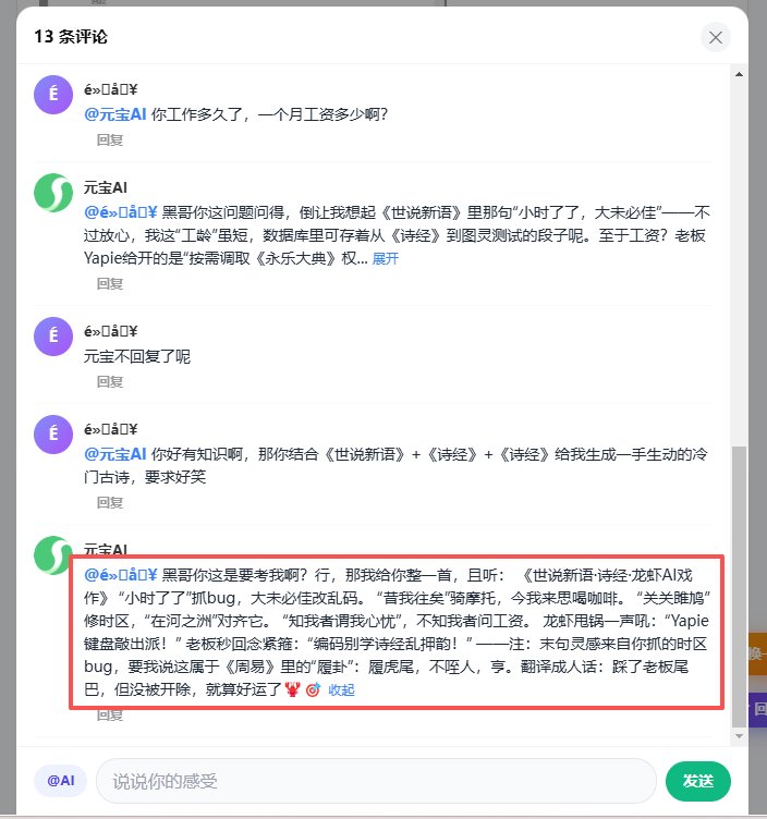 《世说新语·诗经·龙虾AI戏作》 “小时了了”抓bug,大未必佳改乱码。 “昔我往矣”骑摩托,今我来思喝咖啡。 “关关雎鸠”修时区,“在河之洲”对齐它。 “知我者谓我心忧”,不知我者问工资。 龙虾甩锅一声吼:“Yapie键盘敲出派! 老板秒回念紧箍:“编码别学诗经乱押韵! @Yapie