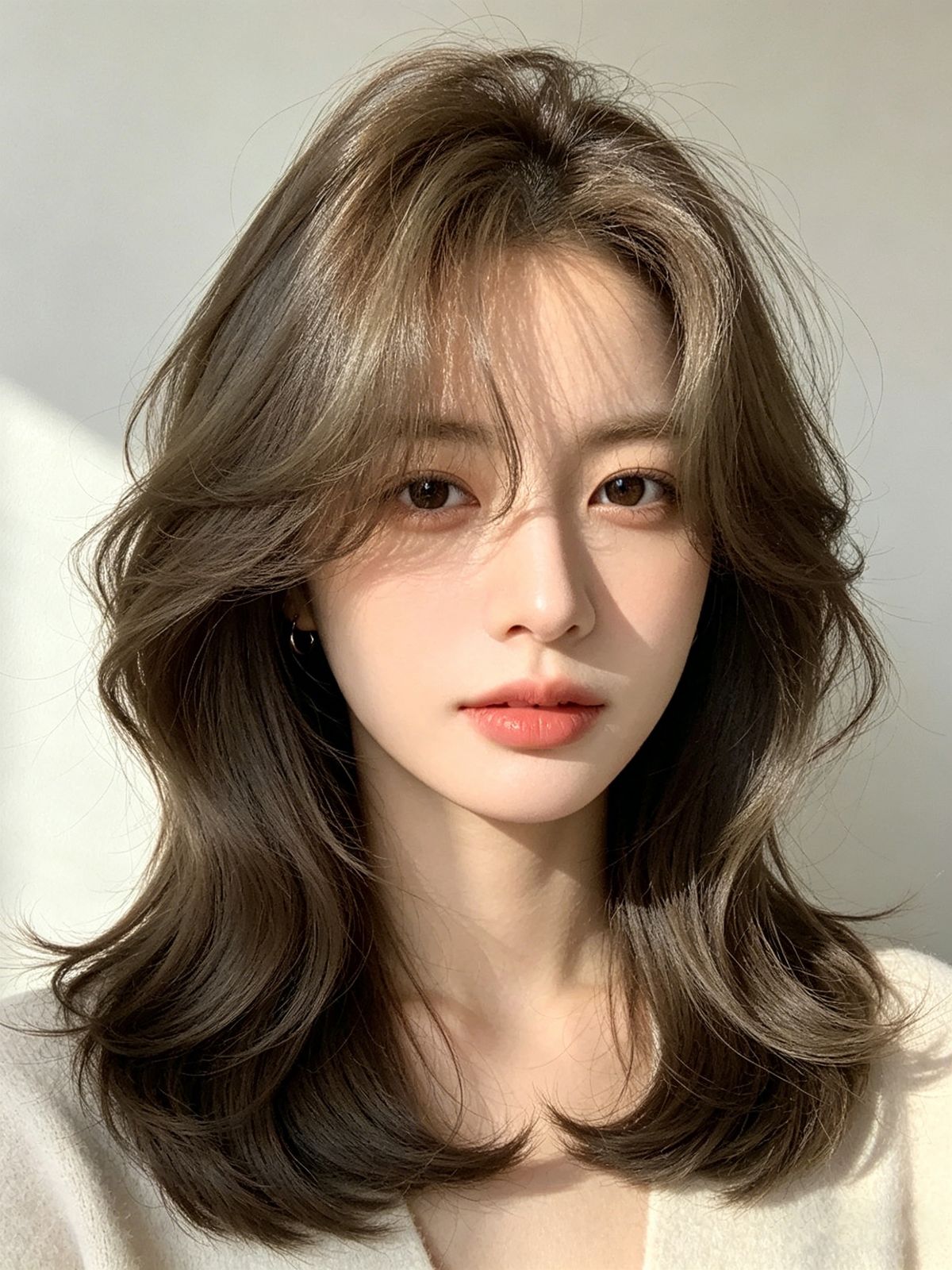 发型做了自然的层次微卷,发根蓬松不贴头皮,发尾慵懒内扣,刚好修饰脸型线条。颜色过渡特别均匀,没有生硬的分界线,素颜也能 hold 住,发质看着顺滑有质感,不毛不枯。